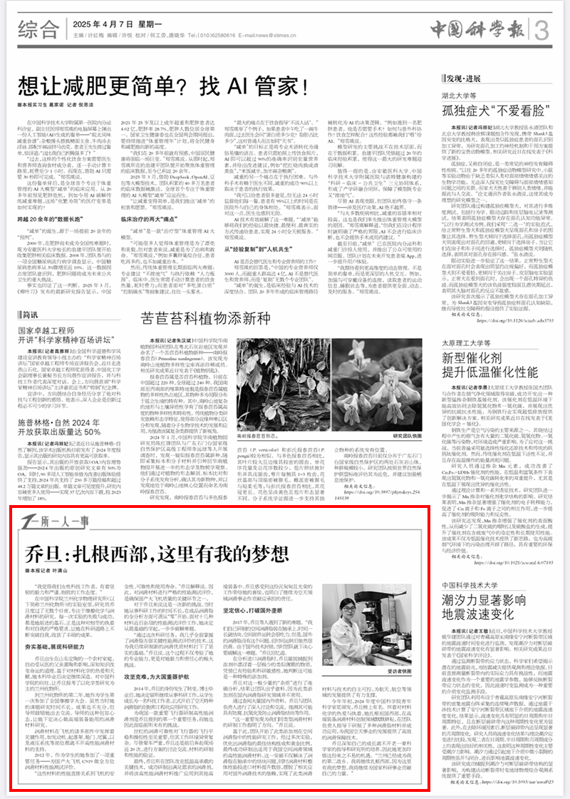 【中國科學(xué)報(bào)】喬旦:扎根西部,這里有我的夢(mèng)想
