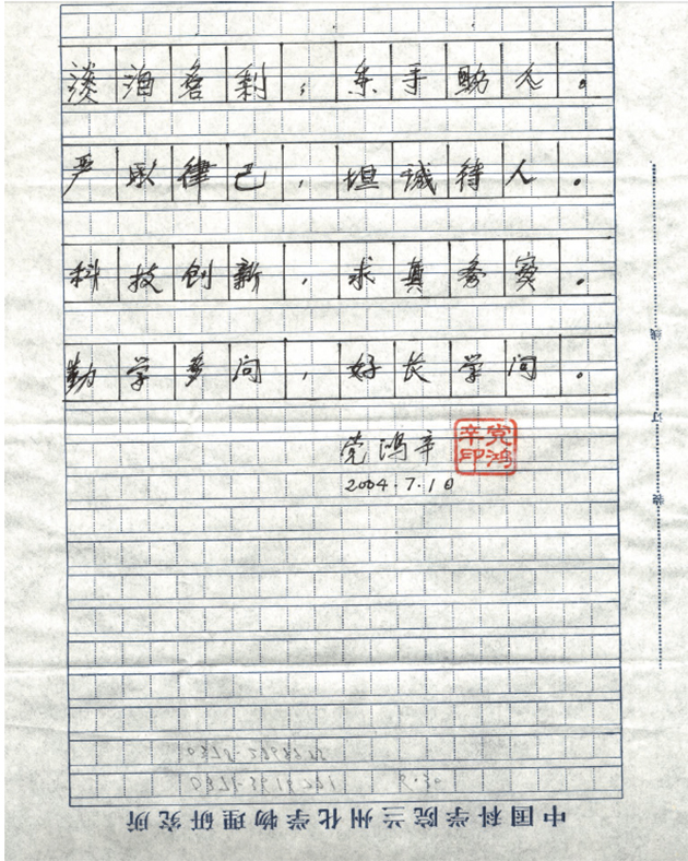 他將這32個(gè)字寫(xiě)完,或許覺(jué)得筆跡太單薄、不夠清楚,他又顫顫巍巍地拿起筆,緩慢而用力地又描了一遍,連一個(gè)標(biāo)點(diǎn)符號(hào)都不忽略,最后鄭重地簽上了自己的名字,并加蓋了自己的私章。看到此情此景,來(lái)探望他的領(lǐng)導(dǎo)和學(xué)生無(wú)比感慨,無(wú)不動(dòng)容。寶貴的遺訓(xùn)彰顯著他嚴(yán)以律己、嚴(yán)謹(jǐn)治學(xué)、誠(chéng)信科研、淡泊名利的崇高品格,他的風(fēng)范將長(zhǎng)存于世,激勵(lì)著后來(lái)者。