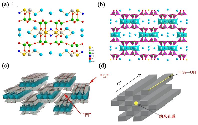 凹凸棒石晶體結(jié)構(gòu)(a, b)和孔道結(jié)構(gòu)(c, d)示意圖(圖片來(lái)源:中國(guó)科學(xué)院蘭州化學(xué)物理研究所)