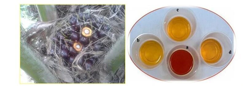 凹凸棒石棕櫚油脫色劑脫色效果對(duì)比,(a)原油,(b,d)凹凸棒石基脫色劑,(c)市售脫色劑