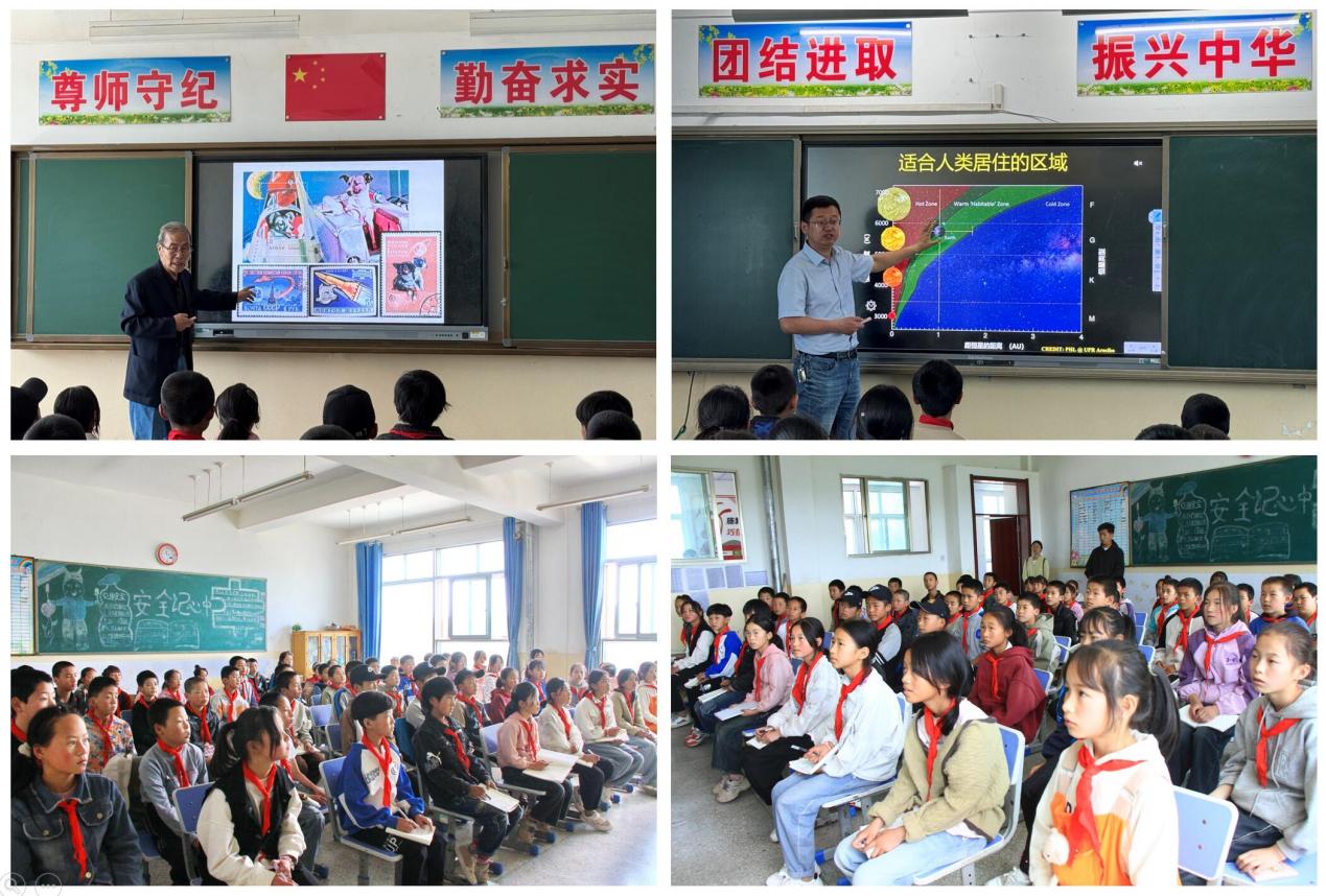 在王泉村鷺島小學(xué),侯明東研究員和侯素青研究員分別作了題為《宇宙在召喚-人類空間探索的故事》和《賞“星”悅目 暢想未來》的科普報告。兩位研究員生動形象、通俗易懂的講述,引起了學(xué)生們的極大興趣,激發(fā)了孩子們對自然科學(xué)的濃厚熱情,同時報告人還結(jié)合個人經(jīng)歷,勉勵同學(xué)們立志成才、刻苦學(xué)習(xí)、通過自身的努力改變命運、報效祖國、回報家鄉(xiāng)。報告結(jié)束后,近代物理所黨辦相關(guān)同志代表研究所為“我的科學(xué)夢”征文比賽中獲獎的同學(xué)頒發(fā)了獎狀,并由青促會小組向王泉村鷺島小學(xué)贈送了一批體育用品,包括籃球、足球、乒乓球和羽毛球拍等,希望能夠豐富同學(xué)們的課外活動資源。鷺島小學(xué)朱宏校長代表學(xué)校對近代物理所長期以來在科技幫扶和教育幫扶方面給予的支持表示衷心感謝,并向研究所贈送了題為“情系鄉(xiāng)村教育、彰顯大愛無疆”的錦旗。