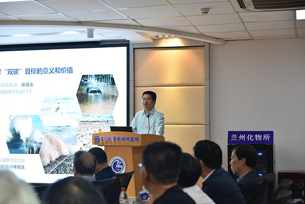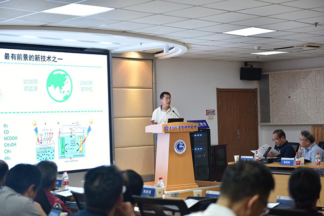 蘭州化物所副所長、黨委委員石峰作了題為“西部地區(qū)資源能源結(jié)構(gòu)與國家‘雙碳戰(zhàn)略’”的主旨報告。介紹了我國碳捕捉、利用與封存技術(shù)(CCUS)的發(fā)展與應(yīng)用,分享了二氧化碳生物利用技術(shù)的綠色生態(tài)理念,就國家“雙碳戰(zhàn)略”和西部地區(qū)資源能源結(jié)構(gòu)進(jìn)行了深入探討。他強(qiáng)調(diào),我國西部地區(qū)太陽能、風(fēng)能等清潔能源豐富,要積極響應(yīng)國家號召,著力解決石化工業(yè)供需不匹配、低碳生產(chǎn)工藝技術(shù)自主創(chuàng)新能力不足等問題。甘肅省飛天學(xué)者特聘教授、蘭州大學(xué)化學(xué)化工學(xué)院丁勇教授作了題為“分子催化劑光催化水分解以及二氧化碳還原研究”的特邀報告。重點(diǎn)介紹了光催化分解水技術(shù)和二氧化碳光催化還原在實(shí)現(xiàn)碳達(dá)峰、碳中和的研究進(jìn)展,討論了二氧化碳光催化轉(zhuǎn)化存在可見光區(qū)吸收弱、分離難轉(zhuǎn)移慢、析氫反應(yīng)等制約發(fā)展的關(guān)鍵問題,分享了其團(tuán)隊(duì)合成了多氧鎢酸鹽節(jié)點(diǎn)的金屬-有機(jī)籠等特定結(jié)構(gòu)的催化劑,并采用引入普魯士藍(lán)類似物作為助催化劑等方法更高效地實(shí)現(xiàn)了光催化的二氧化碳還原。