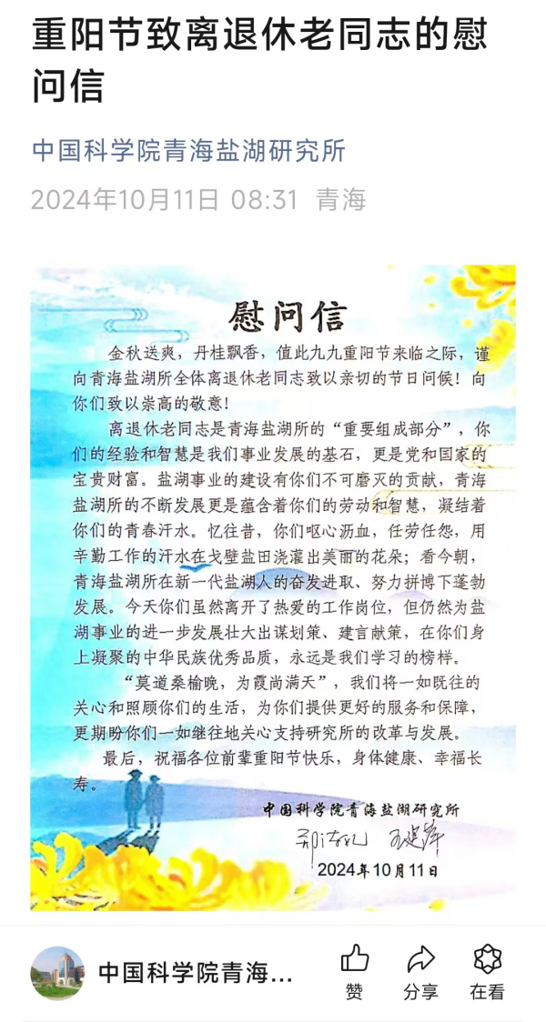 10月11日,在一年一度的重陽佳節(jié)來臨之際,為弘揚(yáng)中華民族尊老、敬老、愛老、助老的優(yōu)良傳統(tǒng),中國科學(xué)院青海鹽湖研究所組織開展了重陽節(jié)關(guān)愛慰問系列活動,讓離退休職工在屬于他們的節(jié)日里感受組織的關(guān)心和節(jié)日的快樂。