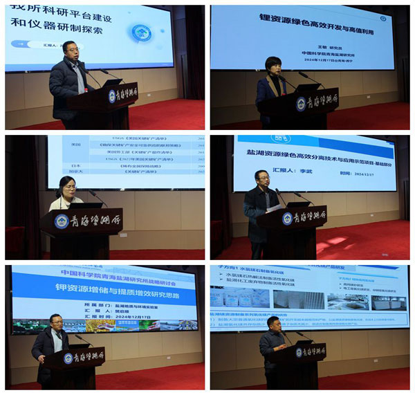 大會開始,鄭詩禮副所長(主持工作)首先介紹了召開此次戰(zhàn)略研討會的背景和意義。隨后,李武研究員、樊啟順研究員、王敏研究員、葉秀深研究員、劉海寧研究員及副所長馮海濤研究員圍繞鹽湖化學基礎研究、鉀資源增儲、鋰高效分離、鎂基結構材料、鹽湖稀散元素和儀器設備平臺開發(fā)六個方向分別以《鹽湖資源綠色高效分離技術與應用示范項目-基礎部分》《鉀資源增儲與提質(zhì)增效研究思路》《鋰資源綠色高效開發(fā)與高值利用》《強化關鍵科學與技術攻關加快推動鹽湖鎂產(chǎn)業(yè)多元化高值化發(fā)展》《鹽湖銣銫溴碘硼高值元素資源增儲與分離提取》《青海鹽湖所科研平臺建設與儀器研制探索》為題作報告。