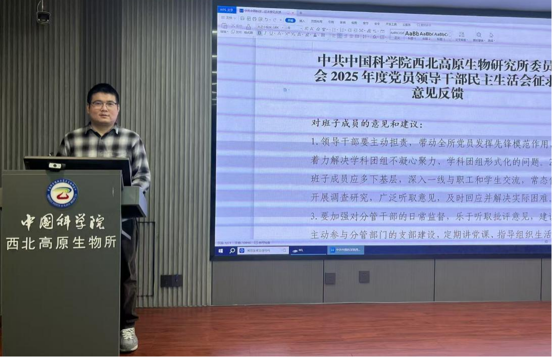 組織委員劉博向全體參會人員通報《中共中國科學院西北高原生物研究所委員會2025年度黨員領(lǐng)導干部民主生活會征求意見反饋》的情況。預備黨員唐有林,發(fā)展對象盧露、孟頤新、李霞、李子雁,入黨積極分子吳玥、宋枚汐依次匯報了本季度思想動態(tài)、學習進展及工作成效。