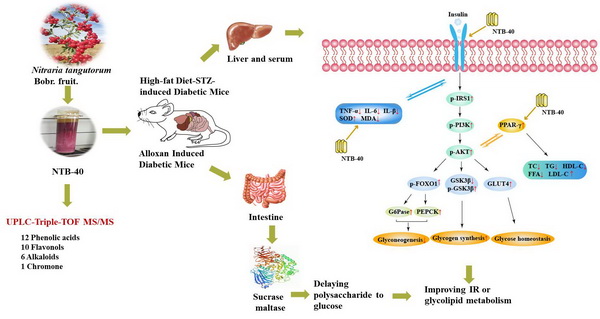 該研究建立了四氧嘧啶誘導(dǎo)的糖尿病小鼠模型,評價了NTB-40不同劑量(100,200,400 mg/kg)降低糖尿病小鼠餐后血糖的情況。淀粉/蔗糖酶/麥芽糖耐量實驗證實NTB-40中高劑量組能夠顯著降低糖尿病小鼠餐后血糖。建立高脂飲食-STZ誘導(dǎo)的糖尿病小鼠模型,研究NTB-40長期給藥對糖尿病小鼠糖脂代謝和IR的影響。結(jié)果顯示NTB-40可以通過維持葡萄糖穩(wěn)態(tài)(FBG、OGTT、ITT、FINS和HOMA-IR)和脂質(zhì)穩(wěn)態(tài)(TC、TG、HDL-C、LDL-C和FFA)從而改善糖脂代謝紊亂和胰島素抵抗,并能減少炎癥(IL-6、IL-1β和TNF-α)和氧化應(yīng)激(SOD和MDA)反應(yīng),減輕肝臟組織損傷。機制研究證實,NTB-40能夠通過調(diào)節(jié)IRS1/PI3K/AKT信號通路和下游蛋白FOXO1、GSK3β、GLUT4的表達(dá),從而降低糖異生,促進(jìn)糖原合成和葡萄糖攝取,實現(xiàn)改善胰島素抵抗的作用效果。