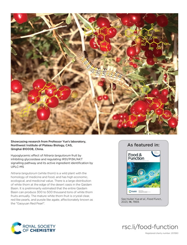相關(guān)研究結(jié)果以Hypoglycemic effect of Nitraria tangutorum fruit by inhibiting glycosidase and regulating IRS1/PI3K/AKT signalling pathway and its active ingredients identification by UPLC-MS為題,于08月30日在Food Function上(一區(qū)Top期刊)以封面文章的形式在線發(fā)表。西北高原所蔣思絨博士為第一作者,岳會蘭研究員為通訊作者。該工作得到了國家自然科學(xué)基金(31900298)、西部之光等項目的資助和支持。同時感謝梅麗娟研究員提供的白刺封面圖片。