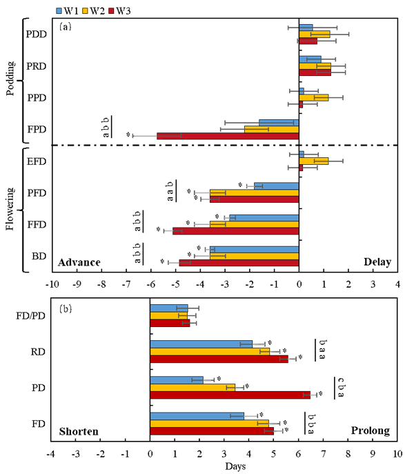 圖2 不同增溫處理下小葉錦雞兒繁殖物候各階段起始時(shí)間(a)和持續(xù)時(shí)長(zhǎng)(b)的變化