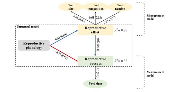 基于此,中國(guó)科學(xué)院西北生態(tài)環(huán)境資源研究院(以下簡(jiǎn)稱西北研究院)科研人員以科爾沁沙地優(yōu)勢(shì)固沙灌木小葉錦雞兒(Caragana microphylla)為研究對(duì)象,探究了不同時(shí)段增溫對(duì)其繁殖物候和種子繁殖力的影響及差異,并從繁殖努力和繁殖成功角度分析了種子繁殖應(yīng)對(duì)季節(jié)非對(duì)稱性增溫的響應(yīng)策略(圖1)。研究發(fā)現(xiàn),繁殖物候通過(guò)提前開(kāi)始、推遲結(jié)束、延長(zhǎng)持續(xù)期和降低同步性來(lái)適應(yīng)季節(jié)非對(duì)稱性增溫(圖2),同時(shí)這種適應(yīng)分別增加和阻礙了種子的繁殖努力和成功(圖4)。繁殖物候適應(yīng)性、種子繁殖努力和成功與生長(zhǎng)季溫度和增溫時(shí)長(zhǎng)呈正相關(guān),而生長(zhǎng)季前增溫對(duì)繁殖努力和成功均有負(fù)面影響(圖3-4)。該研究結(jié)果表明,增溫的季節(jié)非對(duì)稱性和持續(xù)時(shí)間,可通過(guò)調(diào)整繁殖物候模式和種子繁殖性狀來(lái)改變種子繁殖策略,其中生長(zhǎng)季前較暖的冬季和春季降低了半干旱沙區(qū)固沙灌木小葉錦雞兒種子的繁殖力。