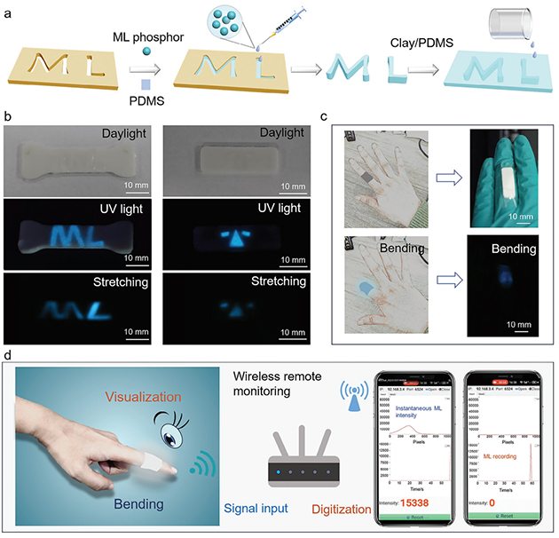 圖3. Ca6BaP4O17:Ce3+/PDMS材料在信息存儲和光子皮膚方面的應用展示。