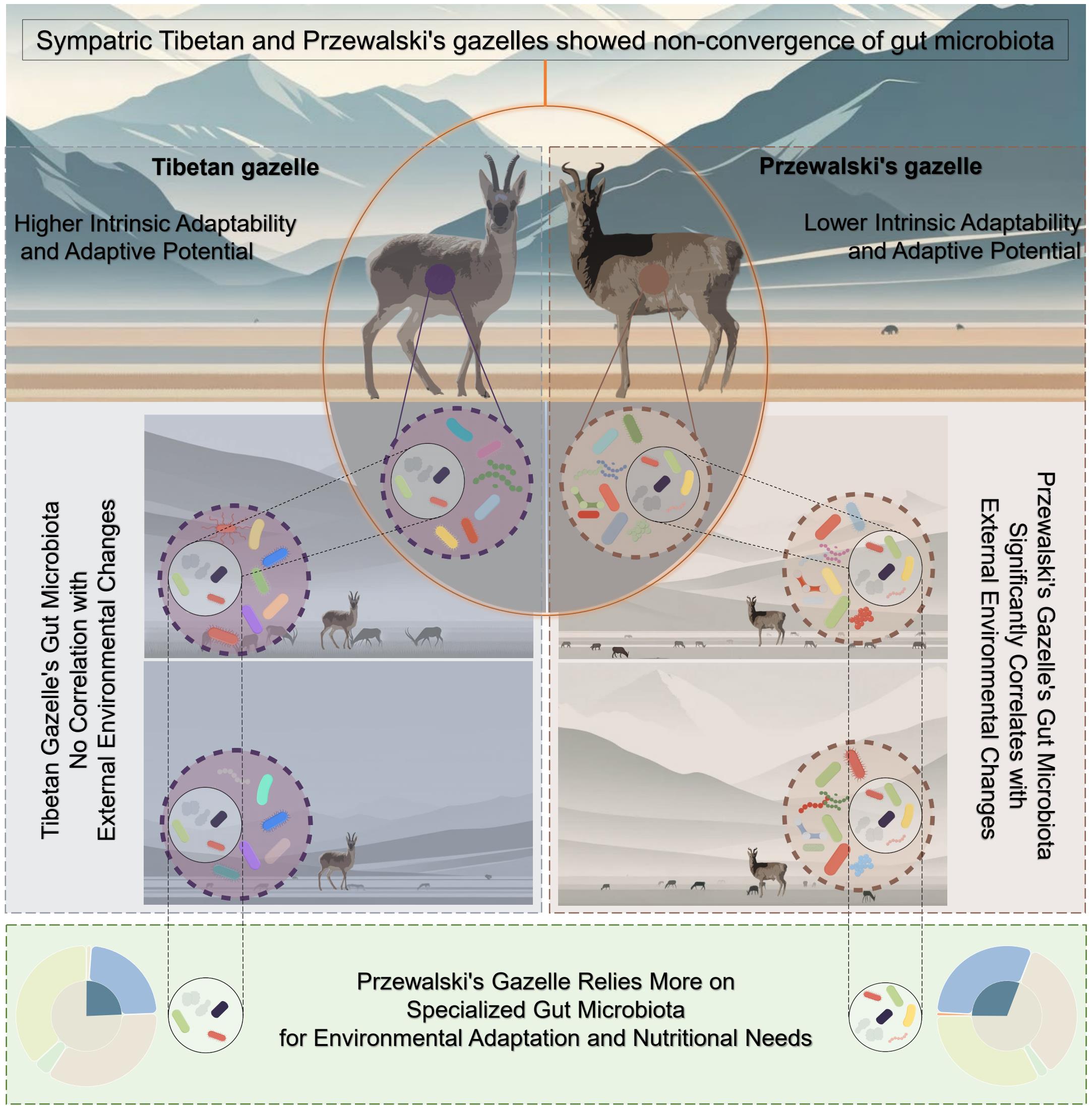 為闡明宿主瀕危程度與腸道微生物依賴性之間的關(guān)系,中國科學(xué)院西北高原生物研究所動物生態(tài)與資源保護(hù)研究團(tuán)隊以藏原羚(近危)和普氏原羚(瀕危)為研究對象,通過16S rRNA擴(kuò)增子測序技術(shù)進(jìn)行高通量測序,深入探究了這兩個物種在相同和不同環(huán)境條件下的腸道微生物多樣性和組成,群落組裝機(jī)制以及預(yù)測功能的變化。研究結(jié)果表明,相較于異域分布的種群,同域分布的藏原羚和普氏原羚種群的腸道微生物多樣性和組成并未因共享相同環(huán)境而呈現(xiàn)顯著的趨同。進(jìn)一步分析發(fā)現(xiàn),藏原羚和普氏原羚腸道微生物與宿主外部環(huán)境變化的關(guān)系存在明顯的區(qū)別,瀕危等級更高的普氏原羚腸道微生物群落結(jié)構(gòu)變異與環(huán)境條件的改變顯著相關(guān),而在瀕危等級較低的藏原羚中,這種相關(guān)性則不顯著。利用iCAMP對兩物種腸道微生物群落的組裝過程進(jìn)行定量分析,結(jié)果顯示普氏原羚腸道微生物群落的組裝過程相比藏原羚更偏向于同質(zhì)選擇過程(HoS)。對促進(jìn)這一轉(zhuǎn)變的微生物類群進(jìn)行分析,發(fā)現(xiàn)在普氏原羚中貢獻(xiàn)了同質(zhì)選擇,但在藏原羚中貢獻(xiàn)了其他過程(如隨機(jī)漂變、擴(kuò)散限制、異質(zhì)分散或異質(zhì)選擇)的ASVs主要隸屬于顫螺旋菌科、coprostanoligenes group、克里斯滕森菌科、阿克曼氏菌科和拉克諾斯菌科。對這些ASVs進(jìn)行功能預(yù)測及KEGG富集分析,結(jié)果表明,其主要與營養(yǎng)物質(zhì)代謝、合成以及免疫調(diào)節(jié)密切相關(guān),提示這些ASVs可能在宿主營養(yǎng)物質(zhì)利用和免疫功能維持等方面發(fā)揮著重要作用。研究認(rèn)為瀕危等級較高的普氏原羚更依賴腸道微生物所提供的“生態(tài)系統(tǒng)服務(wù)”以應(yīng)對環(huán)境的變化。這種依賴性可能源于瀕危物種通常適應(yīng)性和適應(yīng)潛力較低,腸道微生物在其適應(yīng)和應(yīng)對環(huán)境變化中發(fā)揮了重要的補(bǔ)償作用。本研究在揭示宿主瀕危程度與腸道微生物依賴性的關(guān)系的同時,也為瀕危物種保護(hù)和管理提供了新的視角和策略。
