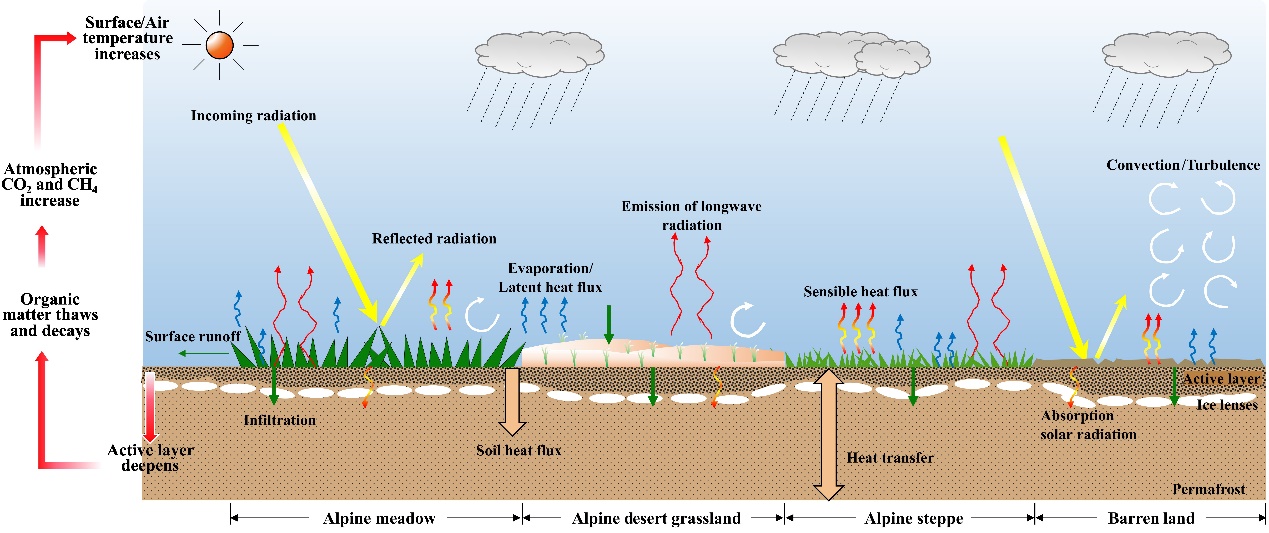圖1 不同高寒草地類型對地表水熱交換的影響以及多年凍土融化釋放碳
