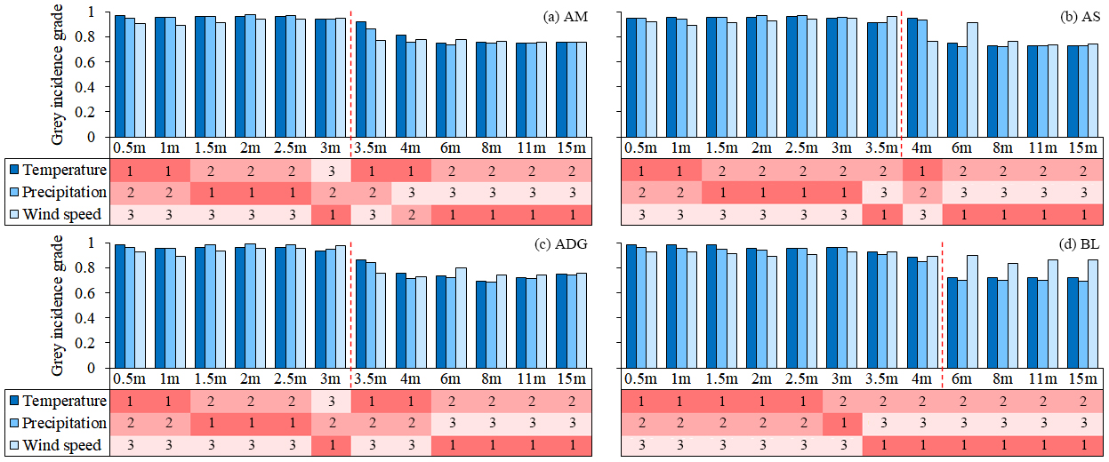 圖2 多年凍土溫度與氣候因子的灰色關(guān)聯(lián)度(直方圖)和三種氣候因子對多年凍土變化影響的相對重要性排序(表)