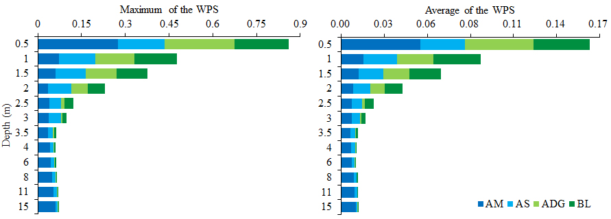 圖3 不同深度年平均多年凍土溫度的小波功率譜(WPS)的最大值和平均值