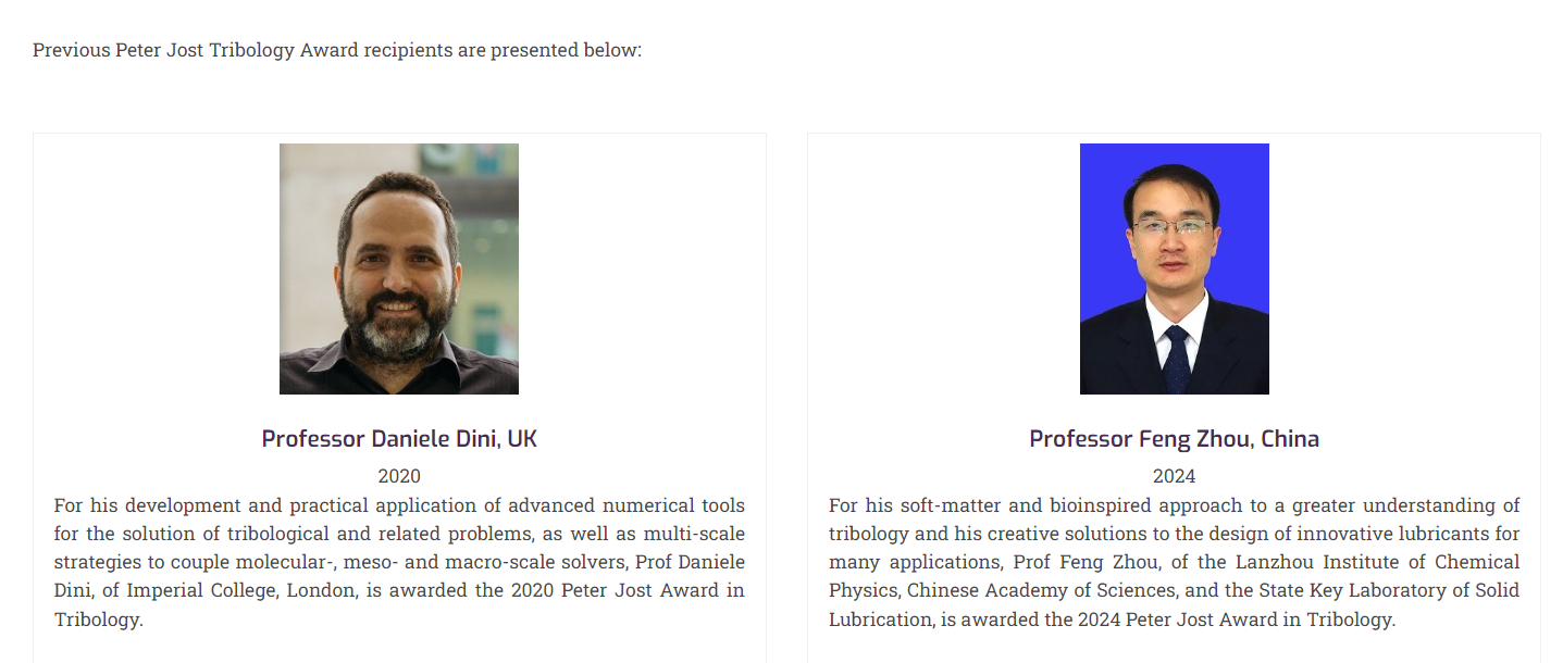 蘭州化物所周峰研究員獲2024年彼得·喬斯特摩擦學(xué)獎(jiǎng)
