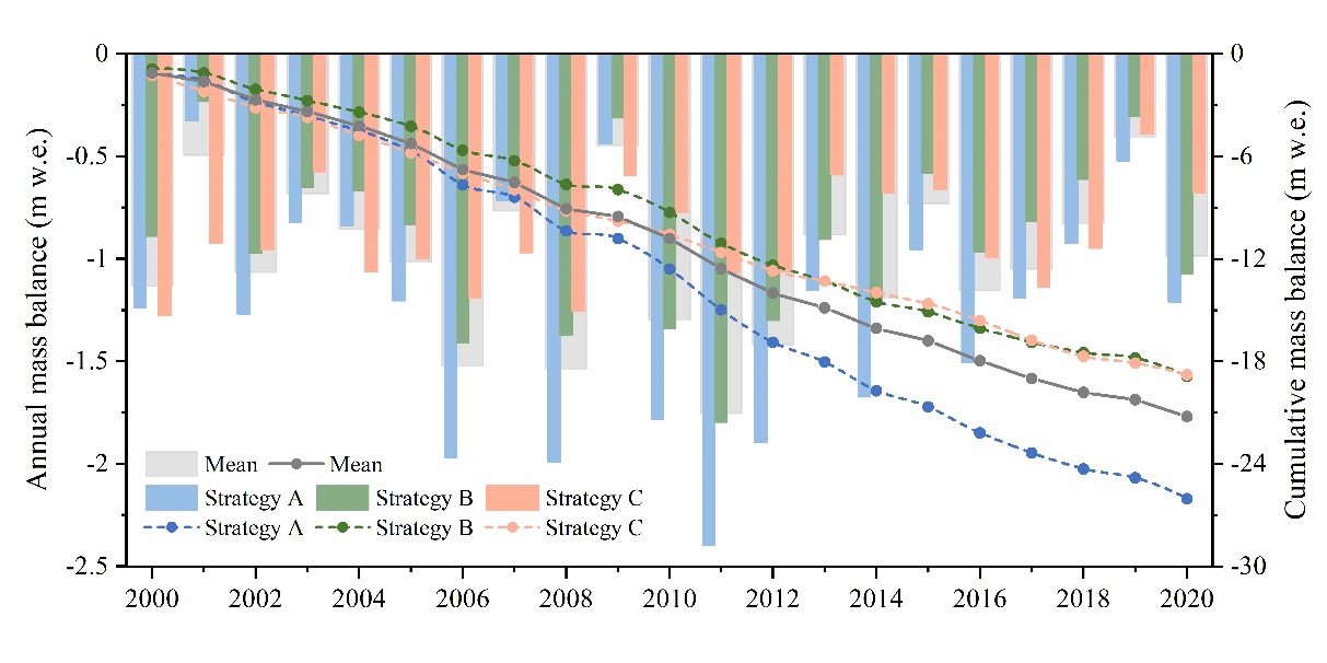 該成果以Historical reconstruction of glacier mass balance and its contribution to water resources in the Sawir Mountains from 2000 to 2020為題發(fā)表于Science of the Total Environment期刊上。碩士研究生余鳳臣為第一作者,王璞玉研究員為通訊作者。該研究獲國(guó)家自然科學(xué)基金、中國(guó)科學(xué)院青年創(chuàng)新促進(jìn)會(huì)優(yōu)秀會(huì)員項(xiàng)目、新疆第三次綜合科學(xué)考察項(xiàng)目和冰凍圈科學(xué)國(guó)家重點(diǎn)實(shí)驗(yàn)室自主項(xiàng)目等聯(lián)合資助。