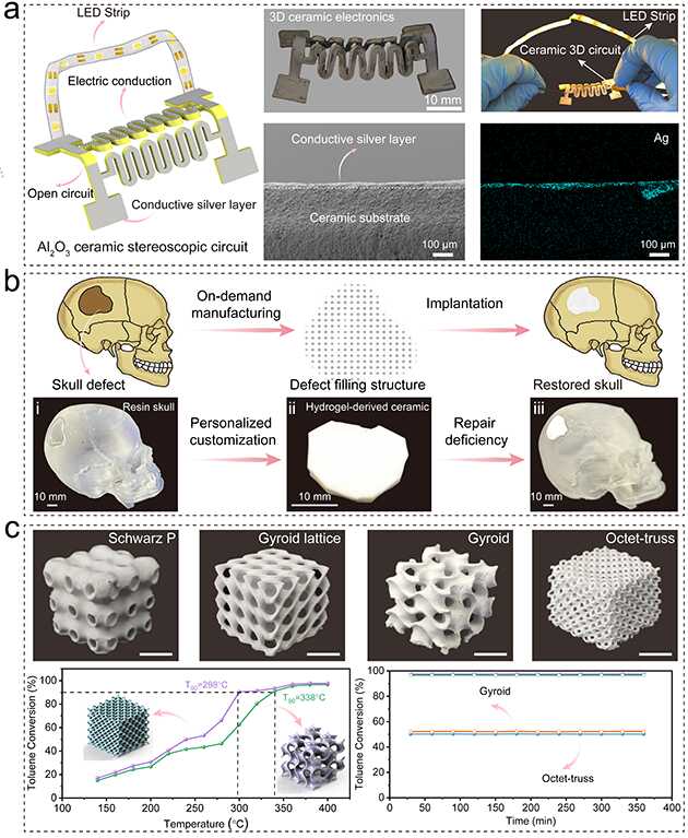 基于此方法,研究人員還可制造無支撐且大跨度的陶瓷三維電路,且這種陶瓷三維電路能很好地點亮LED燈帶。此外,利用水凝膠柔性骨架的可變形性,可按需或個性化制造具有顱骨缺損形狀的陶瓷結(jié)構(gòu)來實現(xiàn)骨缺陷部位修復(fù)。制造的陶瓷結(jié)構(gòu)還可結(jié)合表面改性策略創(chuàng)造性設(shè)計制備高性能的復(fù)雜結(jié)構(gòu)催化陶瓷器件,具有優(yōu)良的催化活性和穩(wěn)定性。研究人員還進一步拓展了這種方法在三維電路、生物醫(yī)用及功能催化領(lǐng)域的潛在應(yīng)用(圖3)。