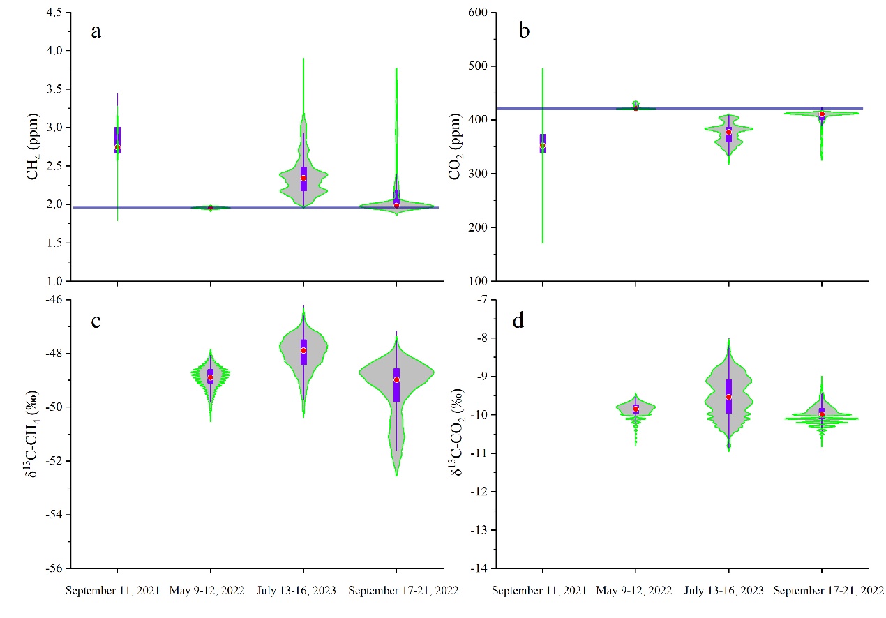 圖2.不同時期冰洞內甲烷、二氧化碳濃度和其同位素特征