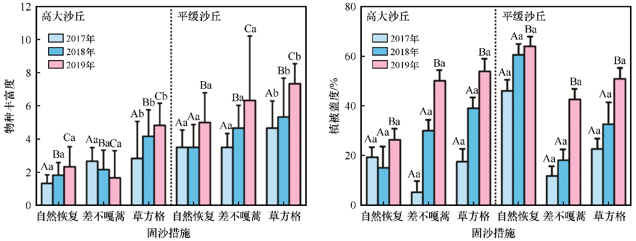 圖1 固沙措施對(duì)沙丘植被群落特征的影響