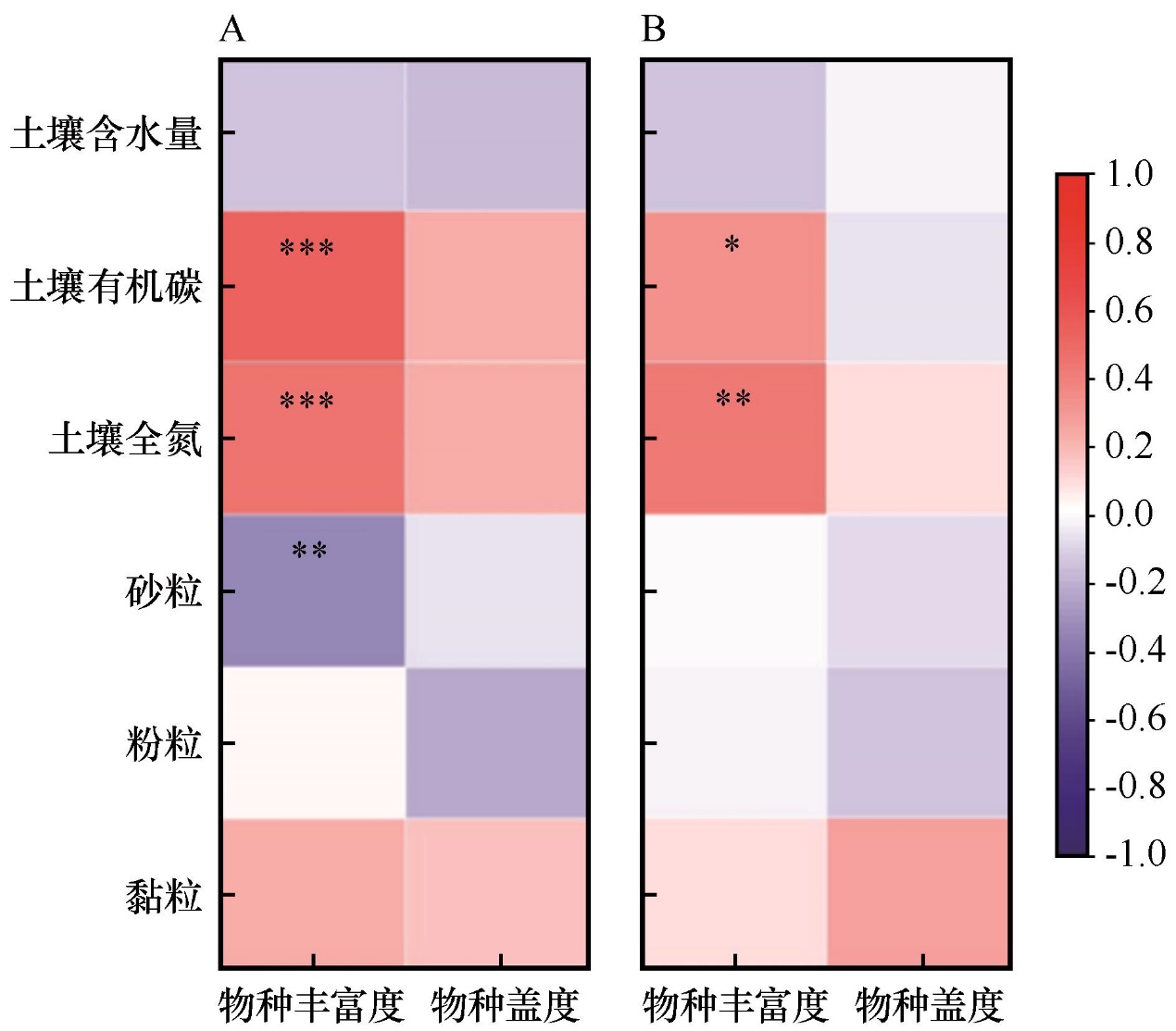 圖2 高大(A)和平緩(B)流動(dòng)沙丘土壤理化性質(zhì)與植被群落特征相關(guān)性分析