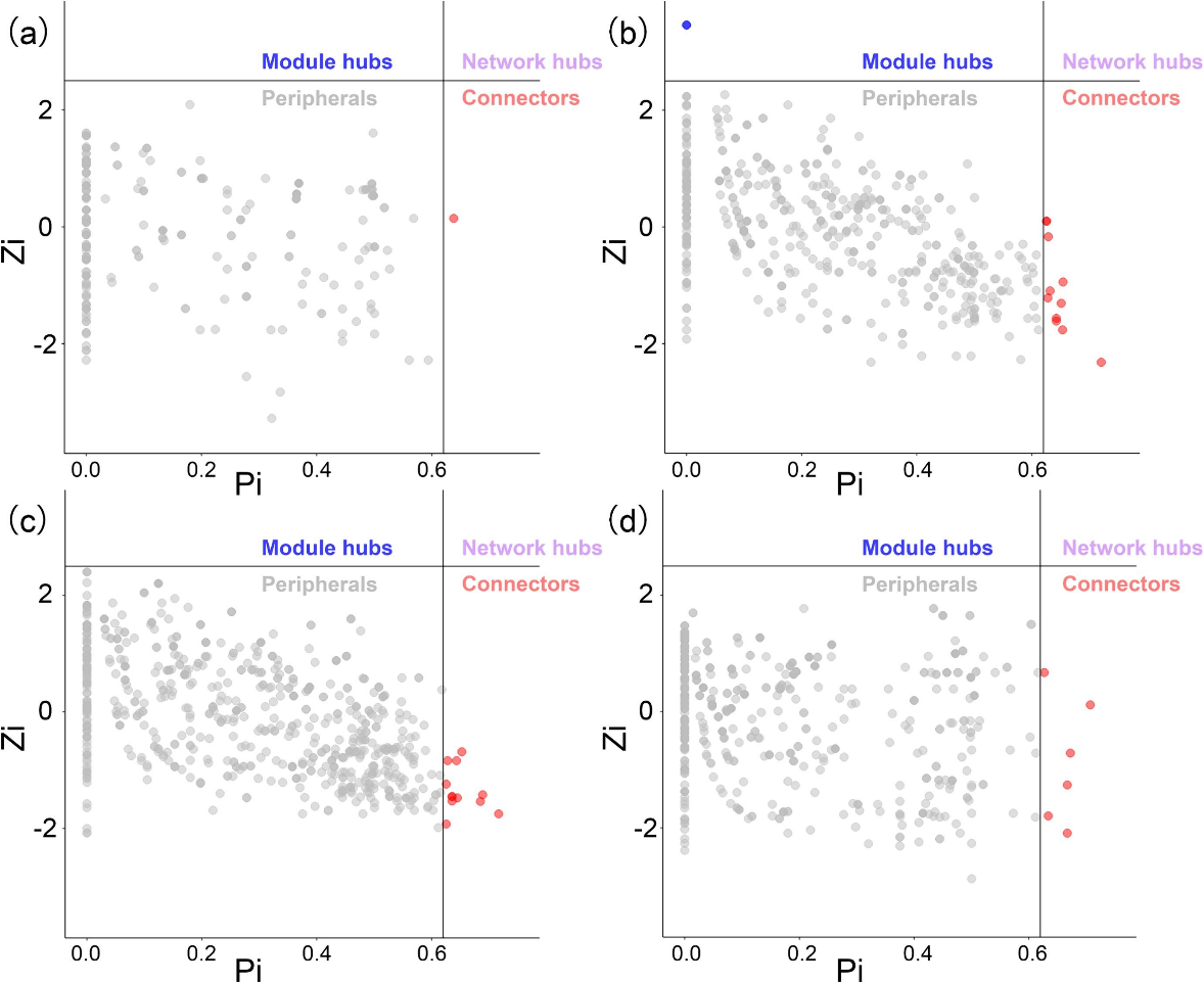 圖 1. 冰川四種生境中細(xì)菌、真菌和古菌群落的跨營(yíng)養(yǎng)級(jí)網(wǎng)絡(luò)關(guān)系