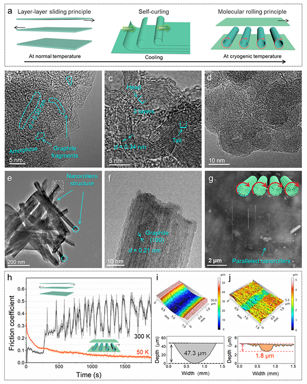 近期,中國科學(xué)院蘭州化學(xué)物理研究所蘭州潤滑材料與技術(shù)創(chuàng)新中心磨損與表面工程課題組和潤滑材料重點(diǎn)實(shí)驗(yàn)室計(jì)算摩擦學(xué)課題組合作在超低溫下石墨摩擦界面演變與分子滾動(dòng)潤滑機(jī)理研究方面取得重要進(jìn)展。研究團(tuán)隊(duì)發(fā)現(xiàn)了超低溫下石墨納米片自卷曲與分子滾動(dòng)潤滑的現(xiàn)象,揭示了分子滾動(dòng)潤滑的界面電子作用機(jī)理,為從分子尺度認(rèn)識(shí)與控制摩擦現(xiàn)象提供了新的認(rèn)知和設(shè)計(jì)原理。