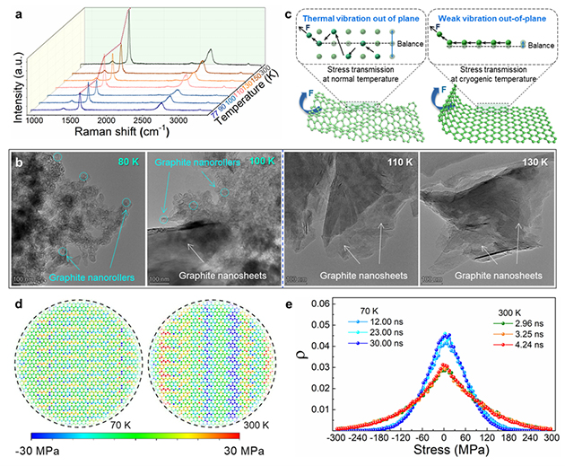 結(jié)合實(shí)驗(yàn)和理論模擬系統(tǒng),研究團(tuán)隊(duì)研究了石墨納米片邊緣自卷翹形變的影響因素、結(jié)構(gòu)演變和形成機(jī)理。結(jié)果表明,超低溫環(huán)境下,非平衡溫度場導(dǎo)致了原子的不均勻收縮,石墨片上下表面產(chǎn)生了方向相反的應(yīng)力,驅(qū)動(dòng)了石墨片邊緣的自卷翹;同時(shí)發(fā)現(xiàn)熱振動(dòng)對(duì)原子間應(yīng)力傳遞的耗散作用,當(dāng)溫度低于100K時(shí),原子熱振動(dòng)顯著減弱,原子間應(yīng)力傳遞耗散被抑制,促進(jìn)了石墨納米片自卷翹形變的發(fā)生。該研究將為認(rèn)識(shí)微觀粒子受力傳遞規(guī)律和納米形變機(jī)理提供新的理解,同時(shí)發(fā)現(xiàn)了一種利用溫度操控自卷曲納米形變行為的新方法,在潤滑、傳感等眾多領(lǐng)域具有廣泛應(yīng)用價(jià)值。