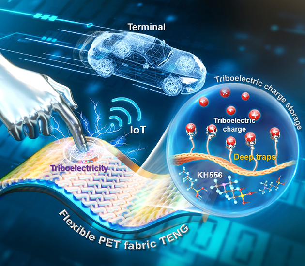摩擦起電過程中產(chǎn)生的電荷會瞬時存儲在電介質表面,進而被兩種不同類型的陷阱(淺陷阱和深陷阱)捕獲。其中,淺陷阱中的電荷容易逸出,優(yōu)先耗散到環(huán)境中,而深陷阱中的電荷則因為極難逸出,可長期儲存。因此,影響摩擦層電荷耗散率的關鍵因素是陷阱捕獲電荷和被捕獲電荷的逃逸能力。基于此,該團隊通過系統(tǒng)研究,揭示了載流子深陷阱在摩擦電荷存儲中的機制,通過分子自組裝技術在織物摩擦層界面構建載流子深陷阱的方式增加TENG的電輸出,將該織物TENG用于物聯(lián)網(wǎng)可穿戴電子設備的電源模塊,實現(xiàn)了對機械運動的穩(wěn)定控制。相關研究成果發(fā)表在Advanced Materials(2024,2303389)上。