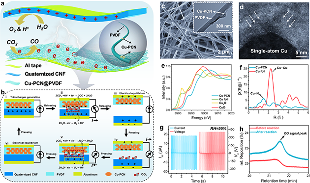 近日,研究團隊與新加坡科學技術研究局的科研人員合作,在界面電荷利用方面做出新突破,利用單原子銅錨定的聚合物碳氮化物催化劑和季銨化纖維素納米纖維成功實現(xiàn)了接觸電催化CO2還原,生成CO的法拉第效率達到96.24?。?/span>。季銨化纖維素納米纖維由于含豐富的羥基,可在高濕度環(huán)境中與水分子形成氫鍵,固定水分子并參與接觸帶電并發(fā)生氧化反應,導致氧氣和質子的產(chǎn)生,參與觸電催化CO2還原過程。這種方法在低濃度CO2環(huán)境中能高效地將其轉化為CO,為減少大氣CO2排放和推進化學可持續(xù)性策略提供了一種解決方案。