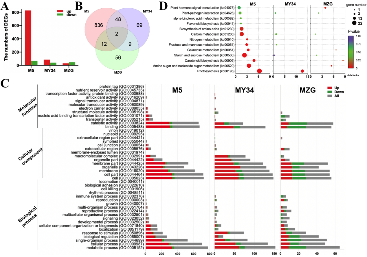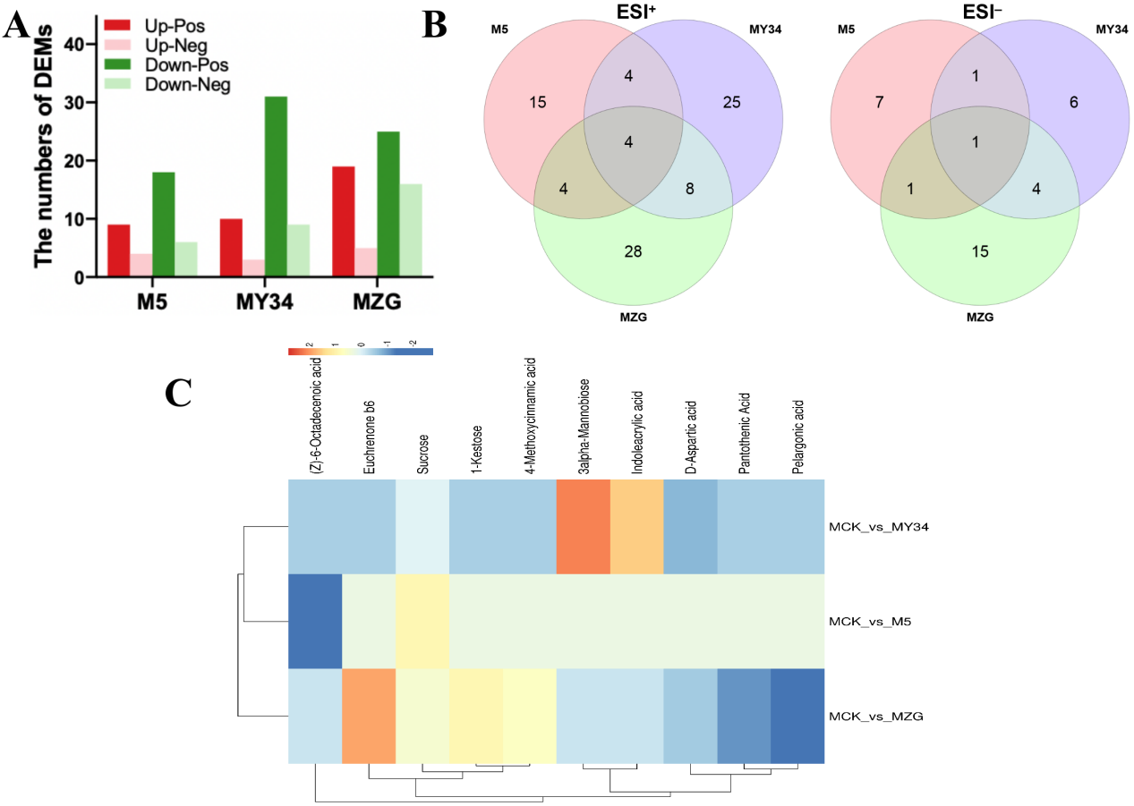 非靶代謝組結果表明,M5顯著積累蔗糖,而MZG和MY34分別顯著積累代謝物Euchrenone b6和甘露二糖。