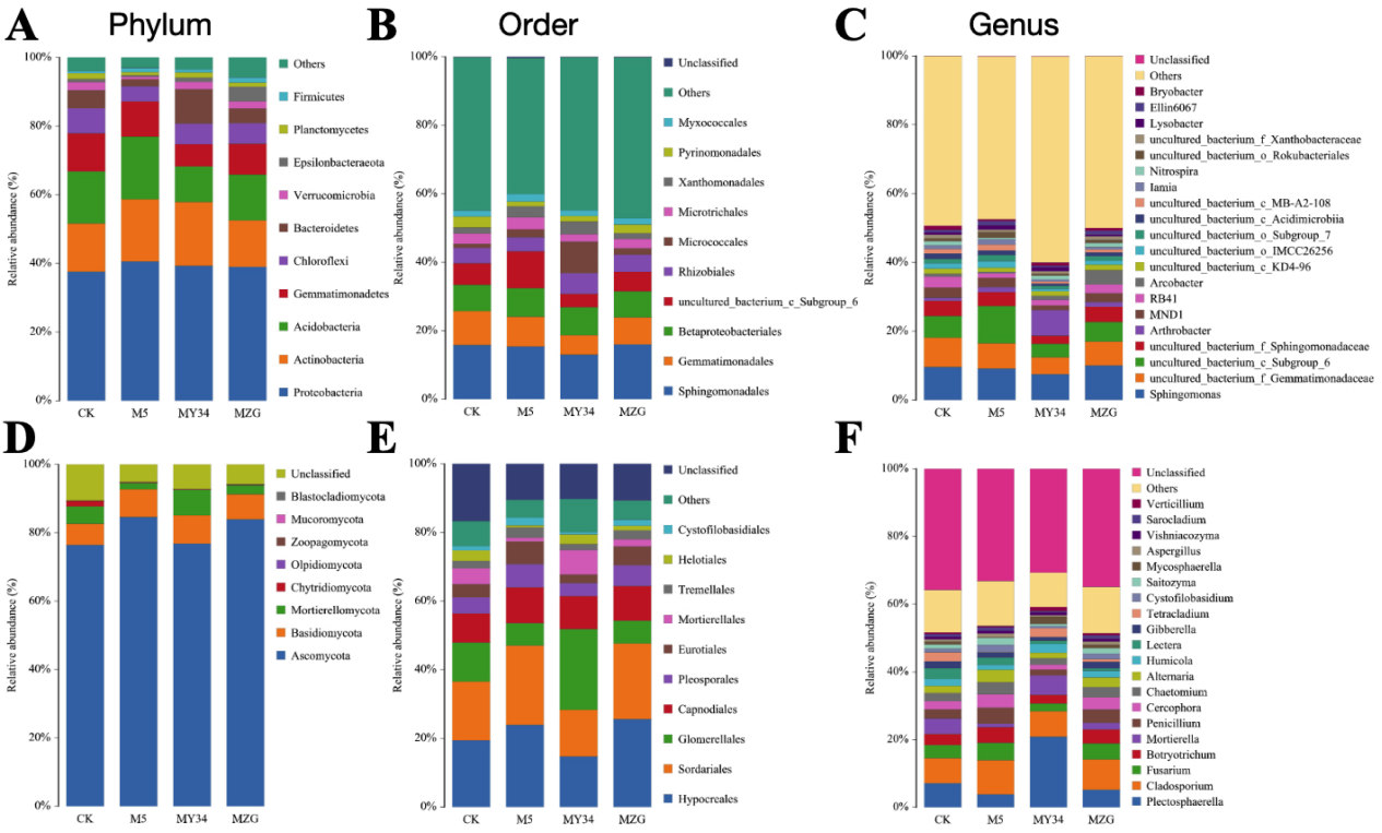 此外,根際微生物組結果表明,三種施用方式均不顯著改變微生物群落結構,但M5和MZG土壤中更易富集有益微生物,如青霉菌;而MY34更易富集嗜糖微生物,如Arthrobacter屬細菌和Plectosphaerella、Mortierella屬真菌。