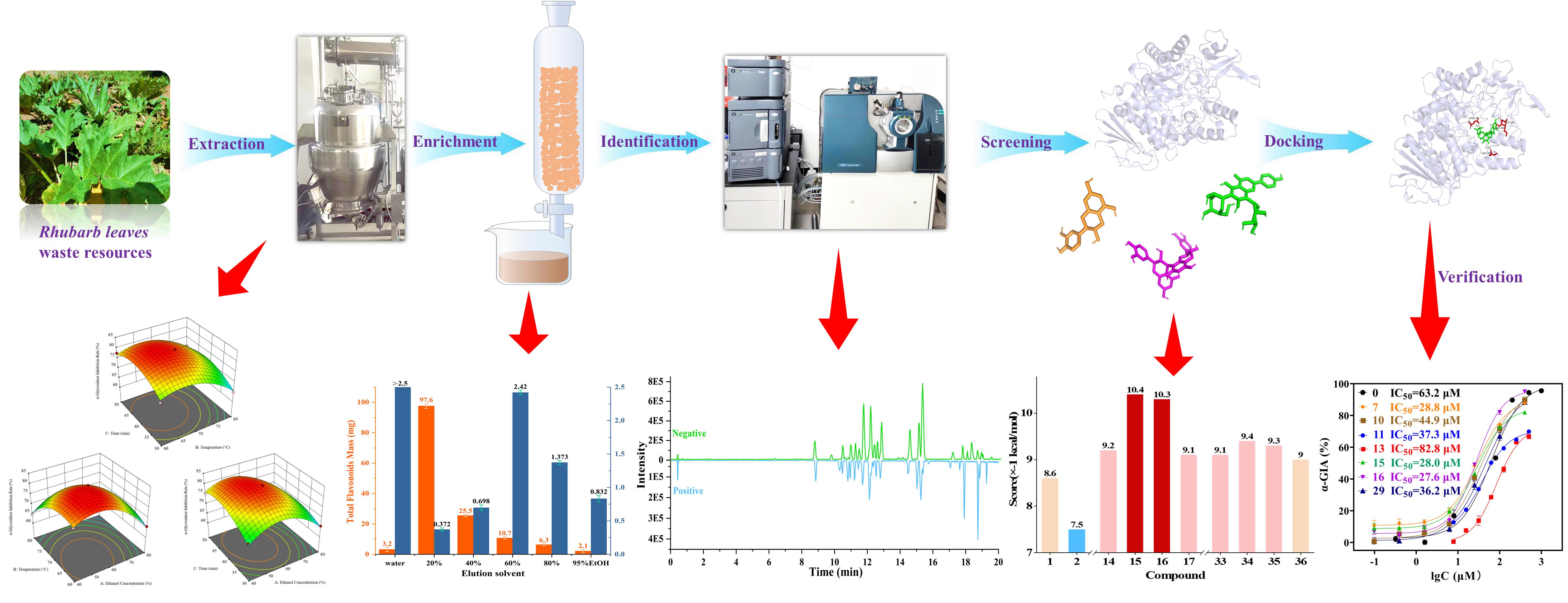 中國科學(xué)院西北高原生物研究所高原藏藥資源質(zhì)控與藥理毒理評(píng)價(jià)研究團(tuán)隊(duì)以α-葡萄糖苷酶抑制活性作為關(guān)鍵評(píng)價(jià)指標(biāo),建立了基于大孔吸附樹脂富集、UPLC-QTOF-MS/MS分析表征、分子對(duì)接、體外驗(yàn)證的唐古特大黃葉中α-葡萄糖苷酶抑制劑的系統(tǒng)篩選策略,篩選得到myricitrin、rumarin等6個(gè)α-葡萄糖苷酶抑制劑?;诜€(wěn)態(tài)、同步、三維熒光光譜和遠(yuǎn)紫外圓二色譜等多光譜技術(shù)的對(duì)接機(jī)制研究表明,6個(gè)抑制劑均能與α-葡萄糖苷酶發(fā)生結(jié)合并改變靶蛋白的酪氨酸和色氨酸殘基微環(huán)境,通過降低靶蛋白α-螺旋或β-轉(zhuǎn)角等二級(jí)結(jié)構(gòu)的含量從而導(dǎo)致蛋白酶失活,該研究為唐古特大黃廢棄資源的利用提供了新的見解。