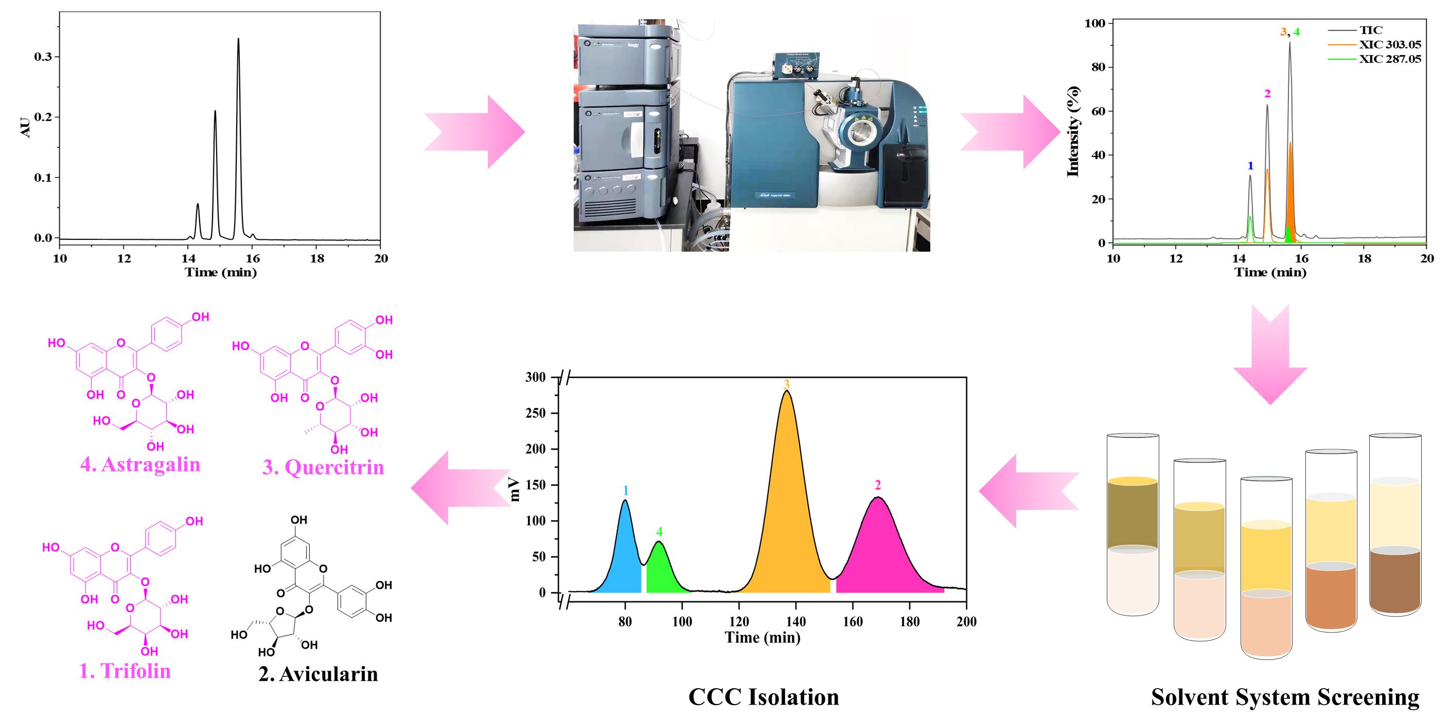另外,由于天然產(chǎn)物組成成分和結(jié)構(gòu)復(fù)雜多樣,常常會(huì)出現(xiàn)色譜共洗脫現(xiàn)象,難以被發(fā)現(xiàn)、分析和分離。針對(duì)這一挑戰(zhàn),研究團(tuán)隊(duì)提出一種基于UPLC-QTOF-MS/MS和CCC的HPLC共洗脫異構(gòu)體的差異識(shí)別和靶向分離策略。通過UPLC-QTOF-MS/MS實(shí)現(xiàn)了對(duì)共洗脫異構(gòu)體的差異特征精確識(shí)別和準(zhǔn)確定量,解決了共洗脫異構(gòu)體無法進(jìn)行CCC溶劑系統(tǒng)篩選的關(guān)鍵技術(shù)問題?;诖瞬呗裕晒奶乒盘卮簏S葉中分離得到astragalin等四種高純度的黃酮類化合物,其中三個(gè)互為異構(gòu)體。該研究為天然產(chǎn)物分離過程中共洗脫異構(gòu)體的分析和分離提供了新的思路。