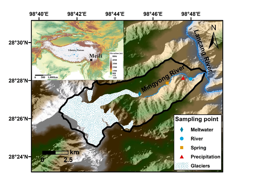 中國科學(xué)院西北生態(tài)環(huán)境資源研究院冰凍圈科學(xué)與凍土工程重點實驗室科研團(tuán)隊,聯(lián)合中國科學(xué)院地質(zhì)與地球物理研究所、浙江師范大學(xué)、云南大學(xué)等多家單位,依托云南麗江玉龍雪山冰凍圈與可持續(xù)發(fā)展國家野外科學(xué)觀測研究站“一站四區(qū)”觀測網(wǎng),在梅里雪山明永河流域開展了為期一年的日尺度觀測,剖析冰川徑流中總汞濃度的變化規(guī)律及控制因素,量化汞的輸入通量,并評估明永河流域以及整個青藏高原冰川徑流中總汞的輸出通量。