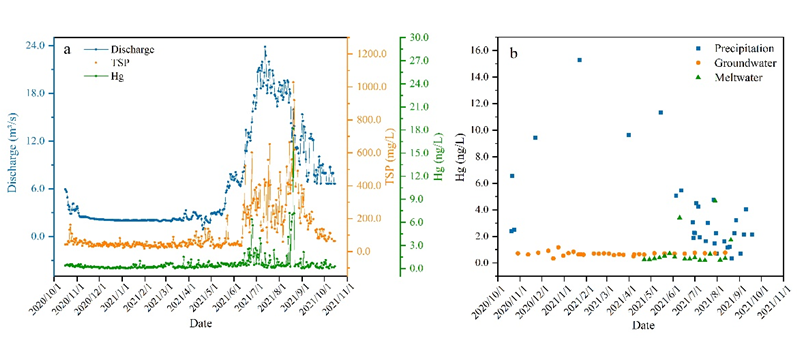研究發(fā)現(xiàn),季風(fēng)期冰川徑流中總汞濃度高于非季風(fēng)期。季風(fēng)期冰川徑流中的總汞濃度與總懸浮顆粒物(TSP)、溶解有機碳(DOC)和溶解無機碳(DIC)呈現(xiàn)顯著正相關(guān)(p < 0.001),非季風(fēng)期徑流中的總汞與TSP、流量、溫度和降水量顯著正相關(guān)(p < 0.001),與DIC呈現(xiàn)負(fù)相關(guān)關(guān)系(p?。肌?.01),表明冰川徑流中總汞濃度受到氣象、水文過程和其它環(huán)境因子的共同影響。