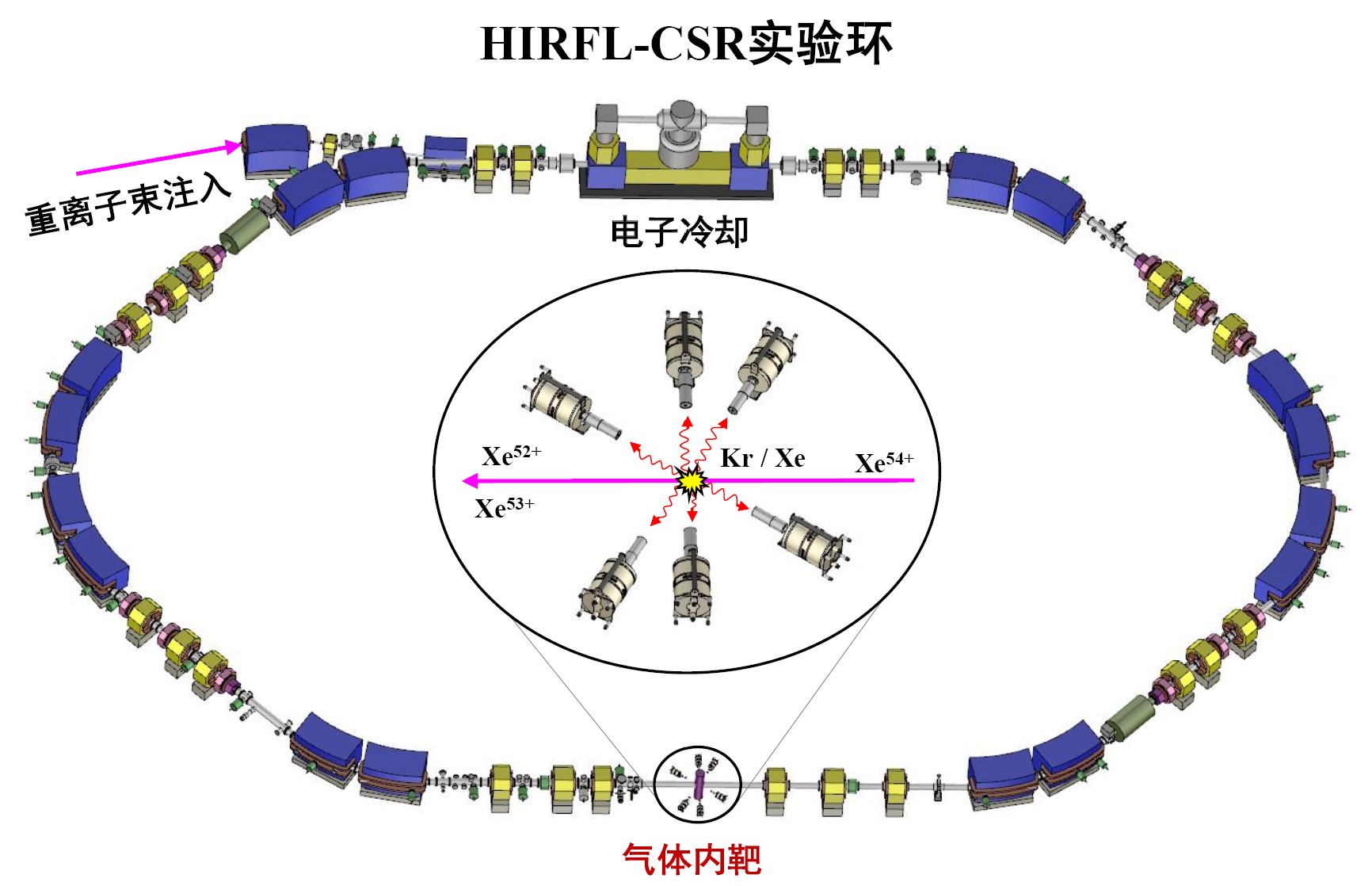 圖:在HIRFL-CSR實驗環(huán)上開展高能Xe54+離子與Kr和Xe原子碰撞中非輻射電子俘獲精細X射線譜的實驗裝置示意圖