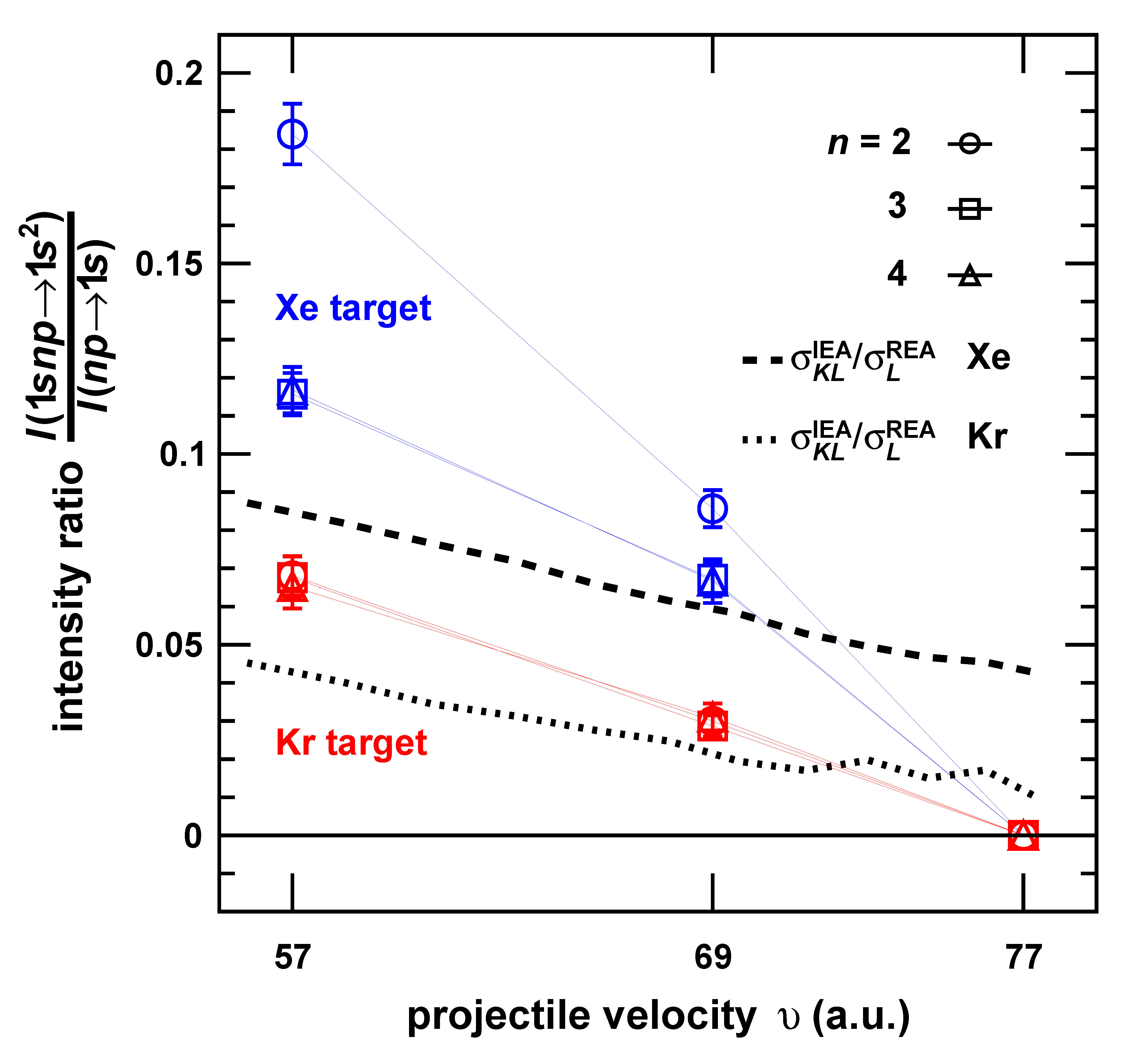 近代物理所原子分子譜學研究團隊利用蘭州重離子加速器冷卻儲存環(huán)(HIRFL-CSR),開展了百MeV/u能區(qū)Xe54++Xe對稱碰撞實驗研究。在“能級匹配”和“速度匹配”條件同時滿足時,團隊發(fā)現共振電子俘獲在非輻射雙電子俘獲(NRDC)過程中起重要作用,引起關聯俘獲,此時獨立電子近似不再成立。與之相反,Xe54++Kr碰撞中的NRDC過程是兩個獨立的單俘獲。