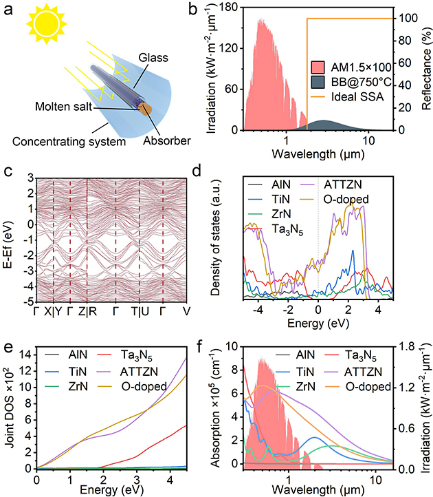 基于高熵氮化物光吸收材料的前期研究,為滿足聚光太陽能系統(tǒng)高溫(750°C)工況下的應(yīng)用需求,研究人員精心選擇了構(gòu)成元素,并系統(tǒng)性地研究了高熵設(shè)計(jì)對(duì)材料電子結(jié)構(gòu)的影響(圖1)。研究結(jié)果顯示,高熵氮化物的復(fù)雜能帶結(jié)構(gòu)顯著提高了費(fèi)米能級(jí)附近的態(tài)密度。同時(shí),平坦的能帶結(jié)構(gòu)拓寬了材料的太陽能吸收范圍,并增強(qiáng)了帶間躍遷效應(yīng),提升了材料的太陽能吸收性能。