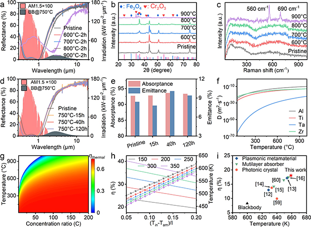 該團(tuán)隊(duì)通過反應(yīng)磁控濺射法制備出由高熵氮化物吸收層和氮化硅減反射層組成的雙層光譜選擇性吸收涂層。在太陽光譜波段(0.3-2.5 μm)表現(xiàn)出92.7%的吸收率,紅外波段的熱發(fā)射率僅為8.4%。在1 kW·m-2模擬太陽光輻照條件下,涂層表面溫度在10分鐘內(nèi)可達(dá)到83.3°C;在戶外應(yīng)用中,其平衡溫度與非選擇性涂層的差異高達(dá)~21°C,展現(xiàn)出優(yōu)異的光熱轉(zhuǎn)換效率和光譜選擇性。此外,得益于高熵效應(yīng)和緩慢擴(kuò)散效應(yīng)帶來的結(jié)構(gòu)穩(wěn)定性,該涂層在750°C退火后仍保持了出色的光學(xué)性能(圖2)。該涂層憑借其出色的光熱轉(zhuǎn)換能力、優(yōu)異的熱穩(wěn)定性和簡單易于規(guī)?;a(chǎn)的雙層結(jié)構(gòu),在提升槽式聚光發(fā)電系統(tǒng)效率方面具有重要意義,并為能源新質(zhì)生產(chǎn)力發(fā)展提供了技術(shù)支撐。相關(guān)研究成果發(fā)表在Advanced Functional Materials?。?/span>2024,2411316)上。趙鵬博士為論文的第一作者,高祥虎研究員和何成玉博士后為共同通訊作者。