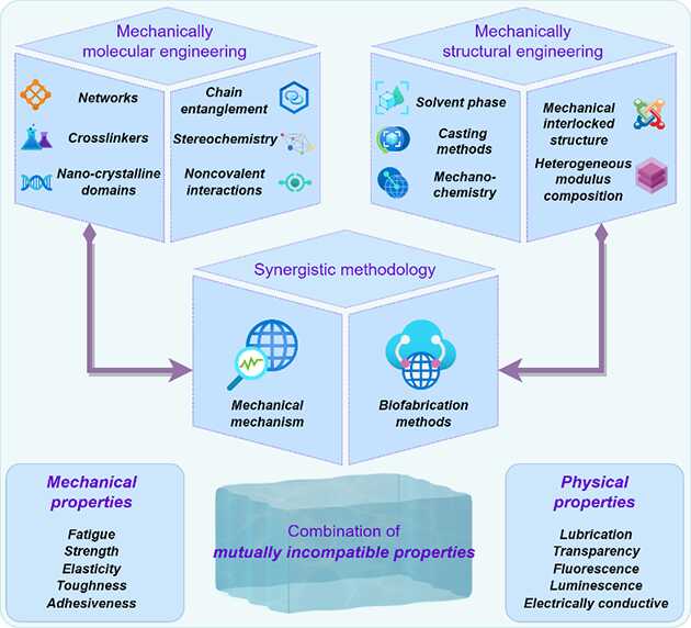 基于力學調(diào)控在分子工程和結(jié)構(gòu)工程的多種調(diào)控策略,研究發(fā)現(xiàn)分子和結(jié)構(gòu)尺度的耦合不僅會獲得極端力學性能,而且為物理和化學多種屬性之間的兼容提供了可操縱手段。作者融合凝膠材料的力學機制和仿生制造方法,提出了“協(xié)同方法學”(synergistic methodology)的調(diào)控思想。在力學性能方面,協(xié)同方法學主要是指將分子工程和結(jié)構(gòu)工程的各種調(diào)控策略完美地集成在同一體材料中,實現(xiàn)不同力學屬性之間的權(quán)衡,尤其在強度、韌性、彈性、疲勞、黏附等;在凝膠功能方面,協(xié)同方法學主要指實現(xiàn)力學性質(zhì)與電學、光學、生物摩擦學等性質(zhì)之間的兼容。聚合物凝膠構(gòu)筑協(xié)同方法學從材料性能和功能兩個調(diào)控視角出發(fā),為解決材料互不相容性質(zhì)之間的沖突提供了新思路,對設計制備具有優(yōu)異性能與特殊功能的新型聚合物凝膠材料具有重要的參考價值和理論指導作用。