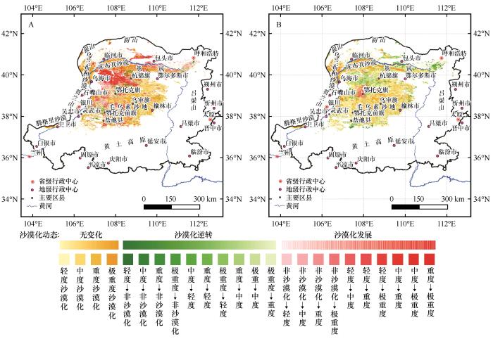 圖2?1975—2000年(A)和2000—2020年(B)黃河“幾字彎”沙漠化程度時(shí)空變化