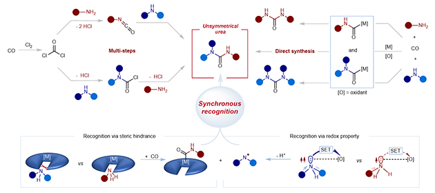 如何基于不同胺物理化學(xué)性質(zhì)的細(xì)微差異,讓兩種不同胺片段找準(zhǔn)位置,連接在同一羰基位點(diǎn),一步合成非對(duì)稱脲是一個(gè)挑戰(zhàn)性難題。中國(guó)科學(xué)院蘭州化學(xué)物理研究所低碳催化與二氧化碳利用重點(diǎn)實(shí)驗(yàn)室何林研究員團(tuán)隊(duì)與武漢大學(xué)雷愛文教授團(tuán)隊(duì)合作,提出了同步胺識(shí)別的概念,在鈷催化中心,當(dāng)一級(jí)胺與二級(jí)胺共存時(shí),僅有一級(jí)胺發(fā)生羰化生成?;锓N,表現(xiàn)出鈷物種對(duì)一級(jí)胺的選擇性識(shí)別;在銅催化中心,一級(jí)胺與二級(jí)胺與銅相互作用過程中,二級(jí)胺能夠快速生成自由基物種,表現(xiàn)出銅物種對(duì)二級(jí)胺的傾向性識(shí)別。首創(chuàng)性利用上述識(shí)別效應(yīng),在胺氧化羰基化一個(gè)催化反應(yīng)中融合親核羰基化半反應(yīng)與自由基生成轉(zhuǎn)化半反應(yīng)全新反應(yīng)機(jī)制,獲得了一步合成非對(duì)稱脲的獨(dú)特反應(yīng)窗口。