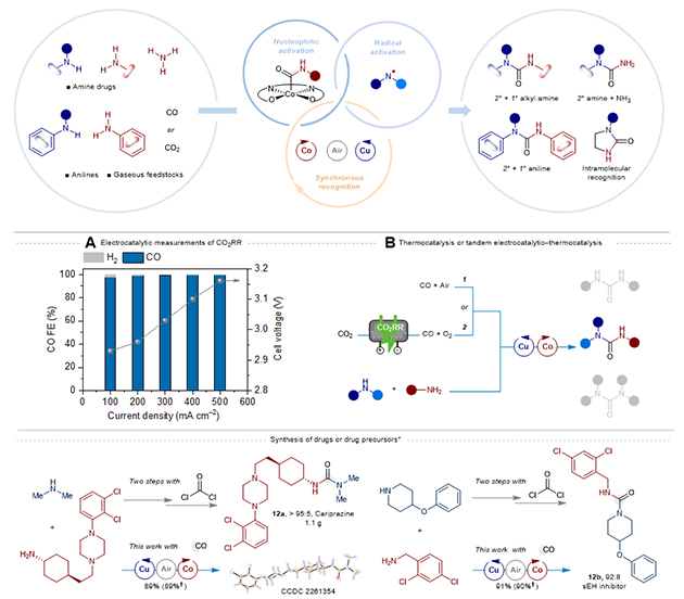 (A)底物適用范圍。(B)從CO2出發(fā)經(jīng)由CO合成非對(duì)稱脲的電熱耦合過程。(C)小分子成藥非光氣路線合成。