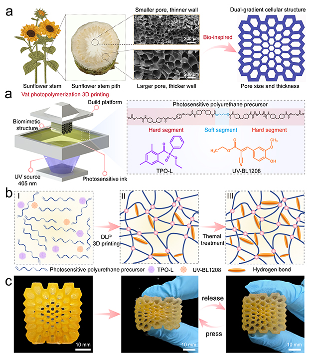 相關(guān)研究成果分別以“Multiple H-bonds Induced Mechanically Robust Vat Photopolymerization 3D Printing Poly(urethane-urea) Elastomers”和“Sunflower Pith Inspired Dual-Gradient Cellular Polyurethane Architecture with Amplified Mechanical Functions”為題發(fā)表在Materials Horizons(Materials Horizons,2024,https://doi.org/10.1039/D4MH01191K)和Chemical Engineering Journal(Chemical Engineering Journal,2024,500,156740)上。石河子大學(xué)聯(lián)培博士生楊星星和中國(guó)科學(xué)院大學(xué)博士生白常成分別為論文第一作者,蘭州化物所劉德勝助理研究員和王曉龍研究員為共同通訊作者。
