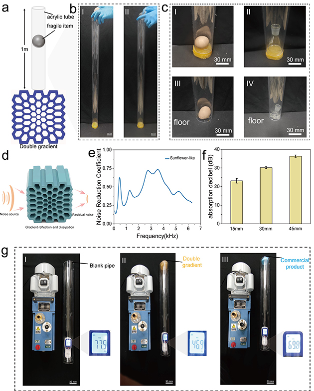 另外,受向日葵髓雙梯度結(jié)構(gòu)啟發(fā),研究人員采用光固化3D打印聚氨酯彈性體設(shè)計(jì)構(gòu)筑了具有孔徑和壁厚雙梯度變量的仿生雙梯度結(jié)構(gòu)聚氨酯。這種仿生雙梯度結(jié)構(gòu)聚氨酯具有選擇性的抗屈曲性以及各向異性的機(jī)械性能和耗散行為,有效提升了其比強(qiáng)度、能量吸收和抗撕裂性特性,解決了傳統(tǒng)多孔泡沫材料性能調(diào)控難、功能單一等問題,在阻尼緩沖減振和消音降噪等領(lǐng)域具有很好的應(yīng)用潛景。