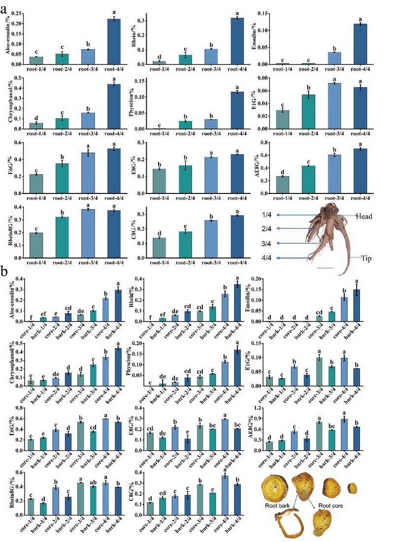 根不同部位從根頭(1/4)至根尖(4/4)的11種蒽醌類(lèi)化合物含量比較(a),以及同一部位根皮和根芯中11種蒽醌類(lèi)化合物含量的比較(b)