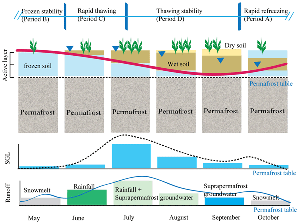 圖1. 多年凍土活動(dòng)層凍融過(guò)程“土壤水-凍土層上水-地表徑流”動(dòng)態(tài)的響應(yīng)理論框架