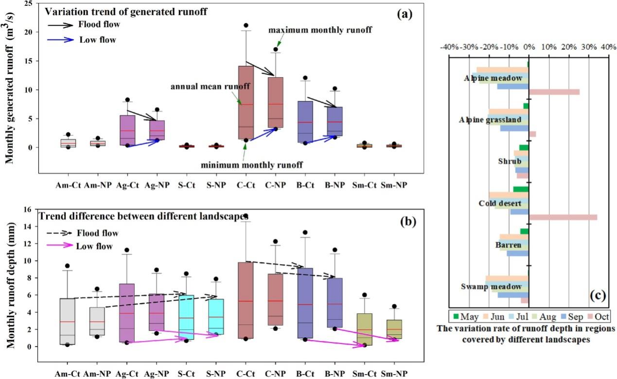 圖2.凍土退化對(duì)典型流域不同下墊面的徑流過(guò)程及水源涵養(yǎng)能力影響。橫坐標(biāo)Am,Ag,S,B,C,和?Sm 分別表示高寒草甸、高寒草原、灌叢、裸地、寒漠和沼澤草甸.?Ct?和?NP?分別表示現(xiàn)狀和凍土退化情景