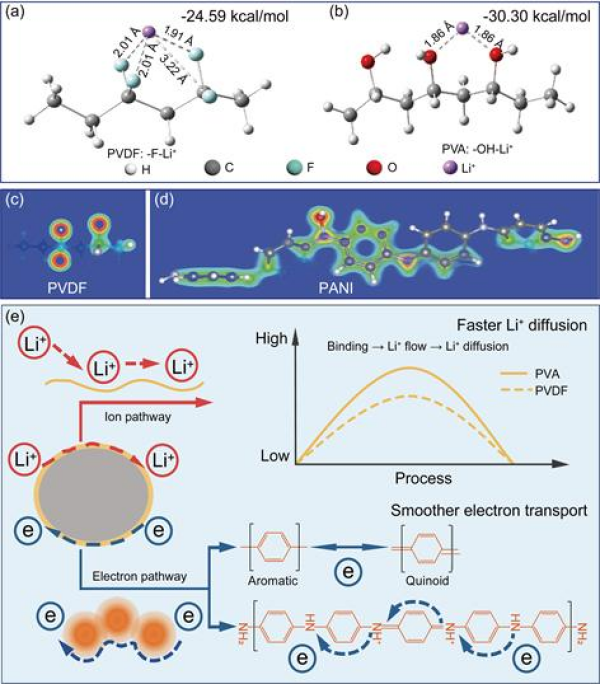 針對電化學(xué)吸附過程中電極內(nèi)Li+擴散速率和電子轉(zhuǎn)移速率不匹配,從而制約電極電化學(xué)活性的問題,設(shè)計和制備了離子和電子雙導(dǎo)聚(乙烯醇)-聚苯胺(PVA-PANI)共聚物(CP),并包覆到吸附劑顆粒表面,促進Li+擴散和電子轉(zhuǎn)移,實現(xiàn)吸附效率的提高。HMO@CP電極具有優(yōu)越的電化學(xué)活性和吸附效率,吸附容量高達49.48 mg/g。機理研究表明,PVA中帶負電荷的羥基(-OH)可以富集Li+并加速Li+的擴散,PANI中的共軛結(jié)構(gòu)和氧化還原活性醌類位點提供了更密集的電子分布促進電子轉(zhuǎn)移(圖1)。該工作以離子擴散和電子轉(zhuǎn)移為出發(fā)點,以提高離子擴散速率和電子轉(zhuǎn)移速率匹配度為導(dǎo)向,實現(xiàn)吸附效率的提高(ACS Nano,18?。?024) 31204-31214)。