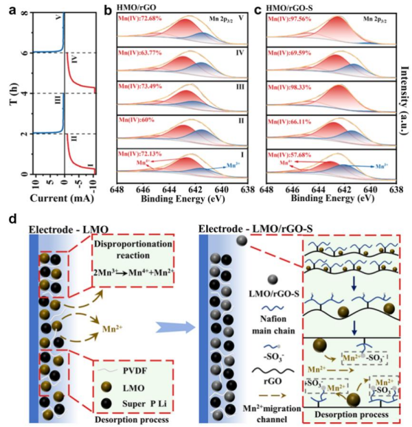 除離子傳輸效率外,針對錳基電活性材料因電極極化導(dǎo)致的穩(wěn)定性較差的問題,采用還原氧化石墨烯(rGO)與Nafion協(xié)同改性的策略制備得到高效穩(wěn)定電化學(xué)吸附材料。rGO在增加材料分散性的同時大幅降低了材料極化,緩解極化過程帶來的容量衰減,使得吸附容量和循環(huán)穩(wěn)定性得到提升。研究表明Nafion通過主鏈與還原氧化石墨烯表面羧基結(jié)合,而支鏈磺酸基團(-SO3-)可以捕獲因歧化反應(yīng)溶出的Mn2+,從而使得材料表面局部Mn2+濃度升高(圖2)。經(jīng)過協(xié)同改性,材料30次循環(huán)容量保持率由79.04%提升至94.64%。該研究驗證了離子捕獲機制抑制歧化反應(yīng)的可行性,能夠為錳系材料在電化學(xué)分離過程中的溶損問題提供新的解決思路(Chem. Eng. J,497 (2024) 155009)。
